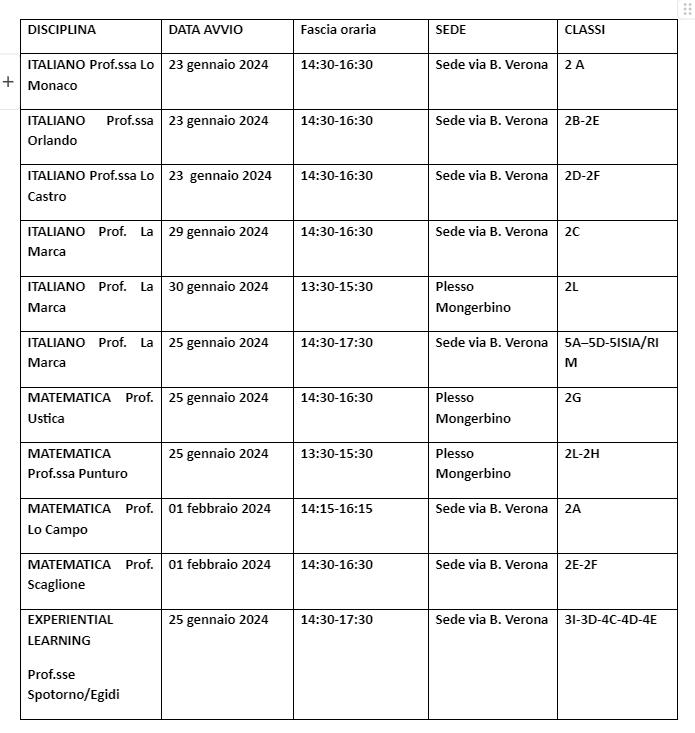 Si comunica che i corsi in oggetto , di ITALIANO- MATEMATICA-INGLESE, finalizzati al rafforzamento del curricolo scolastico e ai percorsi di potenziamento delle competenze di base avranno inizio, per le classi in indirizzo, come di seguito indicato.
