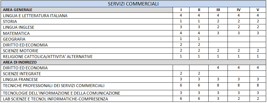 L’indirizzo del Servizi Commerciali rappresenta un buon connubio tra quelle materie che servono alla formazione dello studente e quelle finalizzate alla acquisizione di competenze tecniche. Si spazia quindi dai contenuti di cultura generale che aiutano i ragazzi nel loro processo di crescita ed inserimento nel sociale, fino a quelli finalizzati al lavoro in ambito commerciale. L’uso delle moderne tecnologie informatiche è garantito da una ricca attività laboratoriale che personalizza il percorso e lo rende adeguato alle esigenze attuali in ambito commerciale. Non mancano le lingue straniere come presupposto al lavoro, associato ad un nutrito studio del diritto e dell’economia.